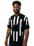 Make a bold statement with this eye-catching black and white striped shirt featuring distinctive red script lettering. This modern take on classic referee-style stripes combines urban streetwear aesthetics with comfortable everyday wear.